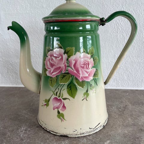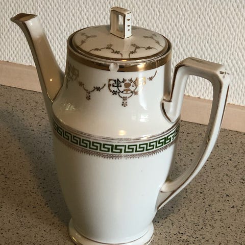 Elegant ældre kaffe-/chokoladekande i fint østrigsk porcelæn. Kanden er dekoreret med håndmalede blomster og guldkant i klassisk jugendstil/early art deco. Slank og smuk form med låg og lang tud.