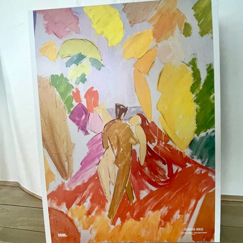 Der kan medfølge en bog af Leo Swane om Edvard Weie og et katalog fra en udstilling i Vejle med nutidskunst. Ejeren af bogen var nok Amtslæge dr med Jakob Jakobsen som havde et portræt lavet af Weie med på udstillingen. Bogen er signeret af Edv Weie Mht pris er jeg også på bar bund men det er jo det eneste der findes så...
