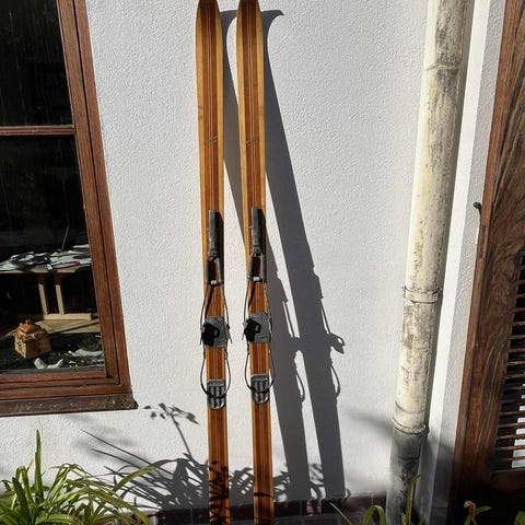 Gamle træ ski sælges. Jeg tænker ikke de kan bruges til andet en pynt/dekoration.