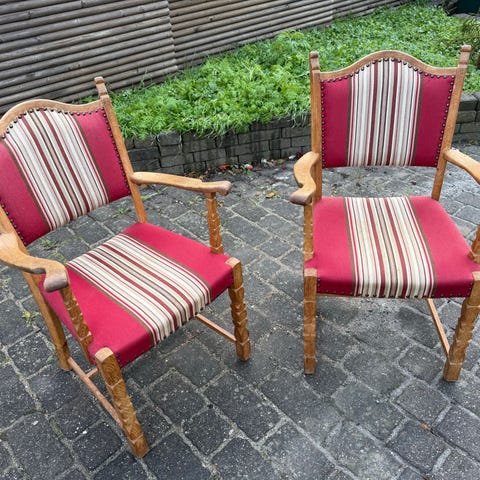 Smukke, solide og charmerende stole med armlæn og lyst betræk.
