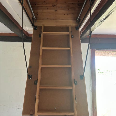 Multifunktionel sammenklappelig stige med sort og blå farve. Stigen kan foldes sammen for nem opbevaring og transport. Velegnet til forskellige opgaver, hvor adgang til højder er nødvendig.