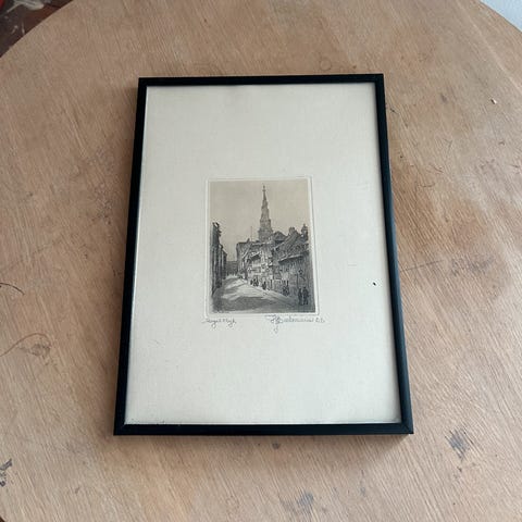 Holmens Kirke – farvelagt tryk af Hjalmer Bachmann (1880-1940). Ramme mål 62x54 cm