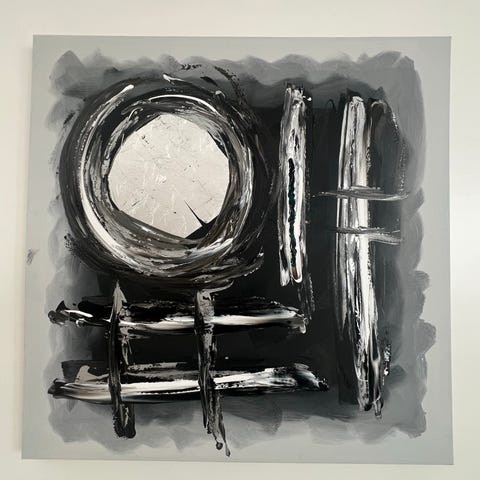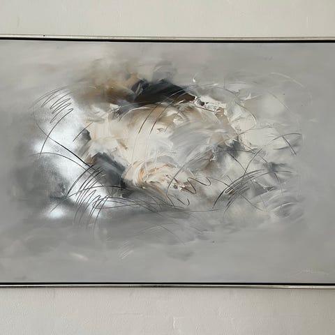 Malerifabrikken. Abstrakte malerier hvid og brun med sølvramme. Malet af Oline.