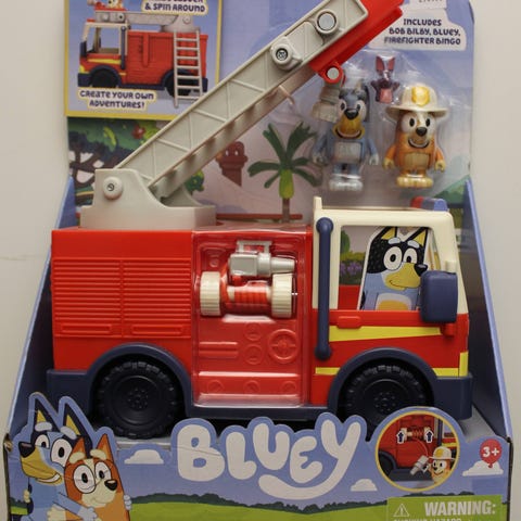 Bluey skraldebil med figurer og tilbehør. Klistermærker med skrald er brugt - nogle sidder stadig på skraldespande.