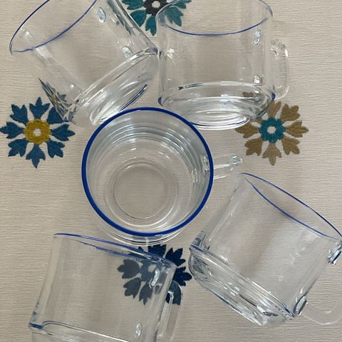 Tre søde retro kopper, i ildfast glas, med holder i plast.
