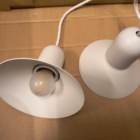 Lampetter til spisebord. Diameter 13 cm + 7 cm i højden. Strømskinne kan medfølge mod en mindre betaling. Der er 3 lampetter + en fjerde som har en lille revne.