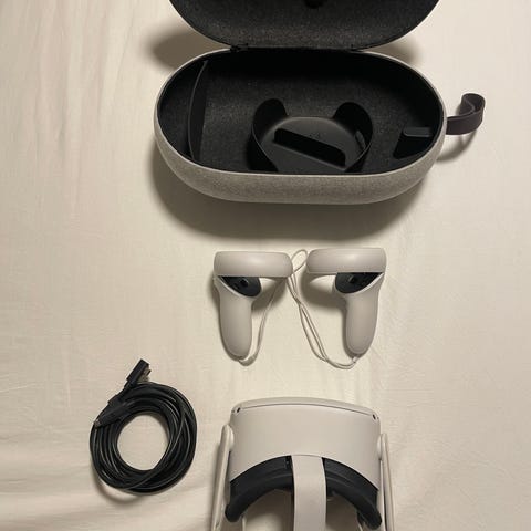 Meta Quest 2 VR-headset med to trådløse controllere. Headsettet har indbygget skærm og sensorer til bevægelsessporing. Controllere er designet til håndholdt brug og indeholder knapper og joystick til navigation og interaktion i virtuelle miljøer. Produktet leveres i original emballage med tilbehør