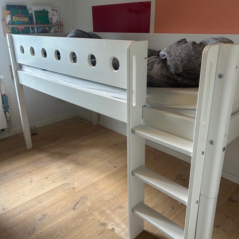 Flexa Popsicle højseng (udgået model). Billedet er fem år gammelt. Der er enkelte ridser / tegn på brug, men sengen er af god kvalitet og føles robust og sikker som fra ny.