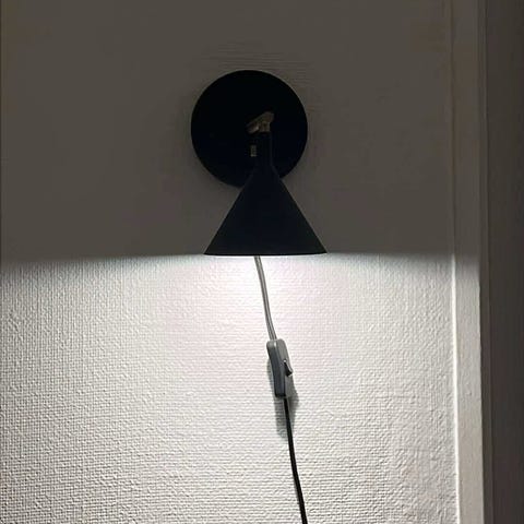 Brainbox væglampe med hvid lampeskærm og elektrisk ledning. Lampen er designet til vægmontering i børneværelset og har et enkelt, funktionelt design.