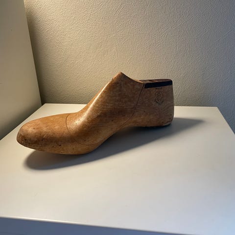 Træ skoform i størrelse 46, fremstillet af træ med justerbare metaldele. Designet til at bevare og forme skoens pasform.