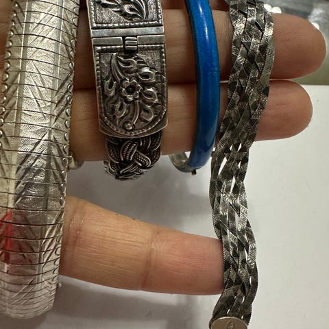 Jeg sælger flere forskellige armbånd i sølv og læder, da jeg ikke længere får dem brugt. Der er bl.a. nogle fra mærket Spinning og mærket Pandora. De armbånd med kryds over er solgt.