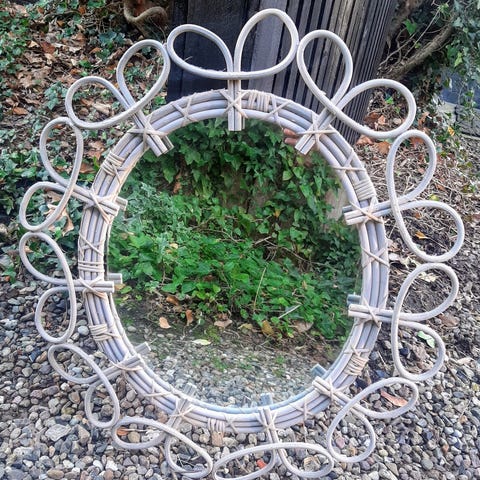 Smukt vintage spejl i bambus. Vældig fin stand. Længde 77 cm. Højde 60 cm.