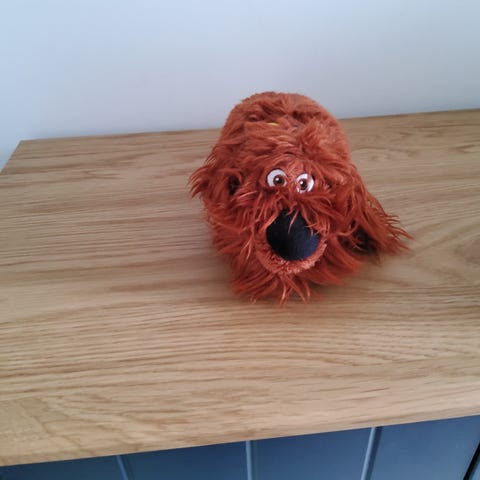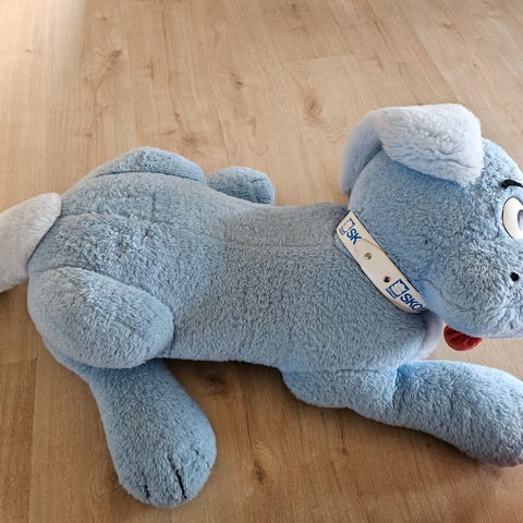 Skofus er købt i en nedlagt Skoringen, og har været til stor glæde for børnebørnene. Stor, dejlig og blød og finder sig i at blive siddet på. Der er mange timers leg tilbage i ham.