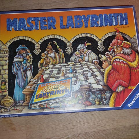 Ravensburger Labyrinth brætspil med spilleplade, brikker og instruktioner. Spillet går ud på at navigere gennem en labyrint ved at flytte brikker for at ændre stierne. Inkluderer spilleplade, brikker og æske med motiv. Velegnet til familiespil og strategispil.