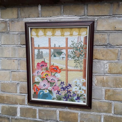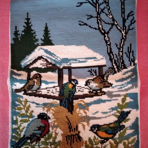 Vævet, trykt og broderet - uld - i original ramme.