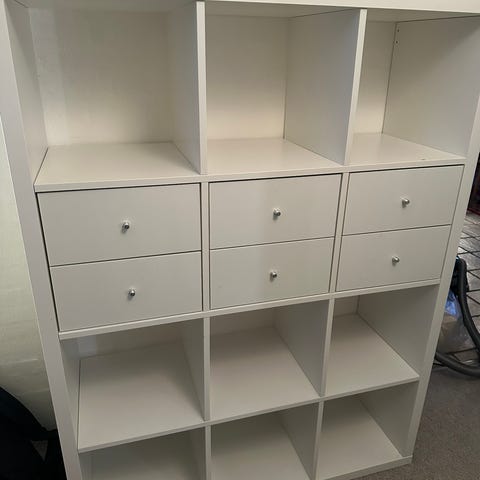 Flot, hvid opbevaringsreol med skuffer og låger – perfekt til kontor eller hjemmekontor.