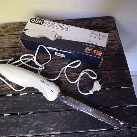 El-kniv fra OBH, står stadigvæk i emballagen, brugsanvisning medfølger og virker som den skal.