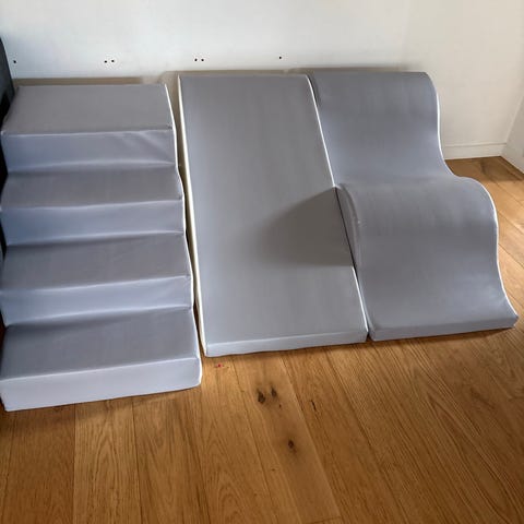 Jeg sælger dette Legeskum sæt med rutsjebane med trappe i modellen er Noah XL i hvid og grå.