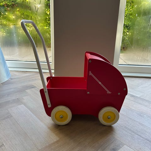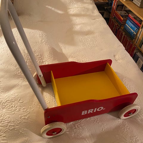 BRIO børnelegetøj trævogn med klodser i træ. Vognen har røde hjul og indeholder klodser med tal, bogstaver og billeder til leg og læring.