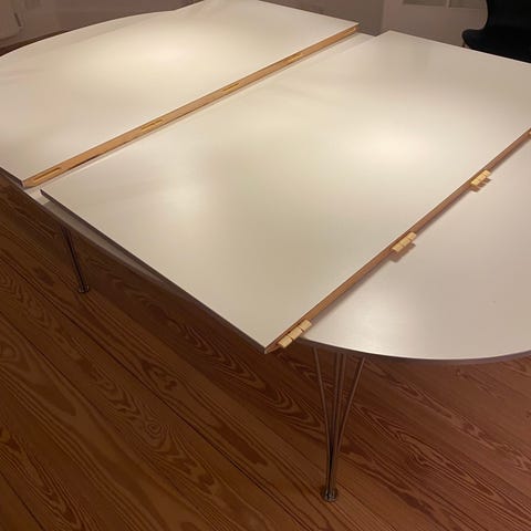 Hvid laminat bordplade, med let overflade slid, ingen store hak. Bordpladen har brugsspor på undersiden, se billeder.