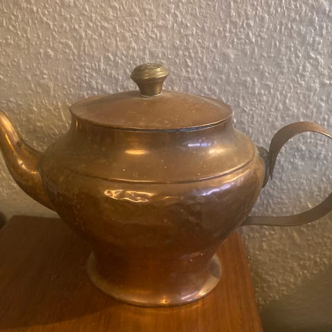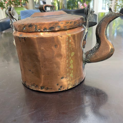 Antik kobberkedel med en aftagelig top og et bærehåndtag.