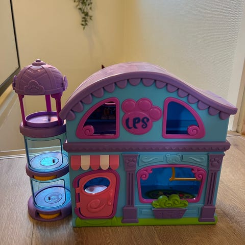 75 kr Littlest Pet Shop legetøj hus i lilla og gul farve. Legetøjet har flere rum og funktioner, designet til børn.