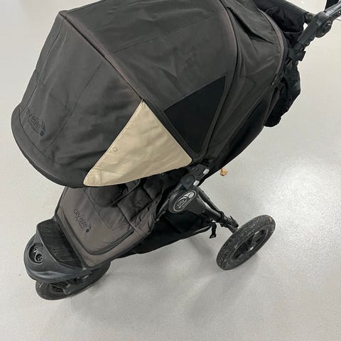 Baby Jogger City Elite 2 klapvogn i mørke grå farve. Klapvognen har tre hjul og inkluderer en aftagelig bakke til opbevaring. Myggenet og regnslag følger også med Designet til børn med fokus på komfort og funktionalitet. Materialet er holdbart og egnet til udendørs brug.