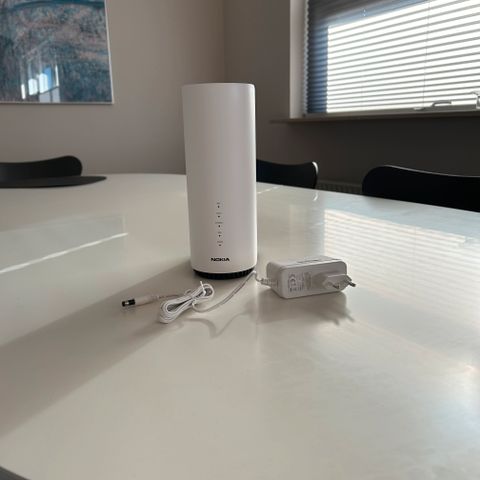 Nokia Router med hvidt kabinet og medfølgende strømforsyning. Enheden har et enkelt LED-indikatorlys på forsiden og flere porte på undersiden til netværksforbindelse.
