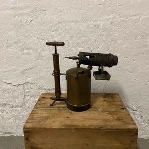 2 stk. Primus blæselamper i patineret messing fra 1900-tallet i meget fin stand. Fra den kendte svenske producent A/B B.A. Hjorth. Desuden loddestempel med brænder også i messing og kobber & stål.