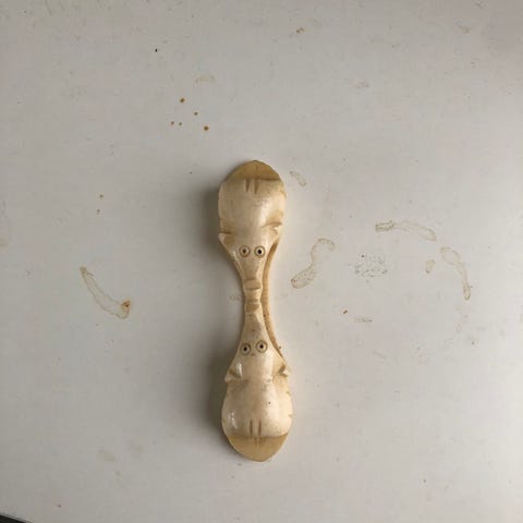 Kunstskulptur lavet af kaskelottand, som forstiller et isbjørnehovede med grønlandske rubiner i øjnene, vender du den om forstiller den en ørn
