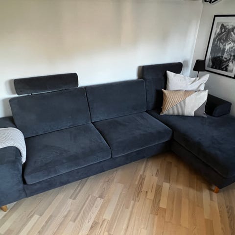 Fed chaiselong sofa fra Ilva af mærket Land, designet af SaysWho. Farven er meleret denimblå - farven fås ikke længere. Den på billedet fra Ilva er en mørkere blå. Den er 4 år gammel, meget velholdt, ingen små børn, ikke ryger hjem. Der er en enkelt plet, se billede. Jeg har ikke forsøgt at rense eller vaske den væk. Prisen sat derefter. Kan afhentes fra på fredag. Købspris 12999