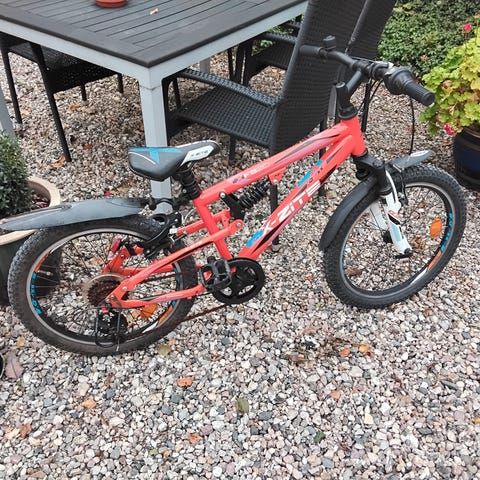 Zerode F-S20 mountainbike i orange farve. Cyklen har fuld affjedring, skivebremser og et stel designet til terrænkørsel. Velegnet til brug på forskellige underlag med fokus på stabilitet og kontrol. Reflekse