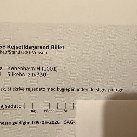 Kan bruges på alle afgange på strækning Vejle - København. Kan sendes for købers regning om nødvendigt.