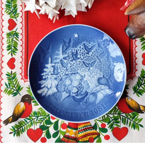 Juleplatte fra Bing og Grøndahl. Svaner i gadekæret ved kirken. Juleplatte 1974. Denner lidt dybere end dem fra Royal Copenhagen men passer stadig til både morgenmad, frokost, kage og dessert. Og de kan sagtens blandes da de har samme blå glasur og samme diameter. Ø18 cm. Du kan loppesjoppe den for 50 kr.