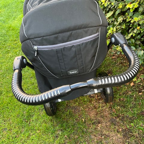 Emmaljunga barnevogn i grå farve. Barnevognen har store hjul og justerbar kaleche. Den er designet til at give komfort og stabilitet under brug.