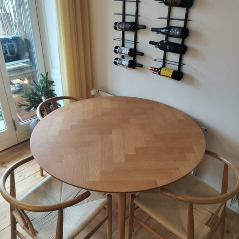 Rundt spisebord i egetræ fra Ilva med sildebens mønster i bordpladen.