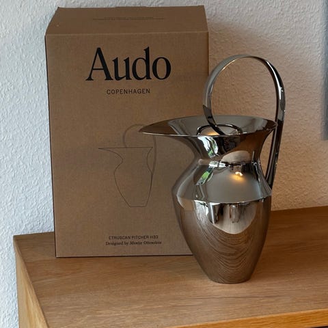 Ubrugt Audo Copenhagen kande i metal med håndtag. 33cm Kanden har en blank finish og en unik form. Velegnet til servering af drikkevarer eller pynt. Aldrig brugt kun stået som pynt.