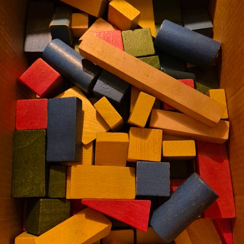 1 hel kasse med Gamle Bio Blo klodser parat til at lege med. Det er kunnfantasien der sætter grænser når man lger med de sjove klodser fra 3år opefter.