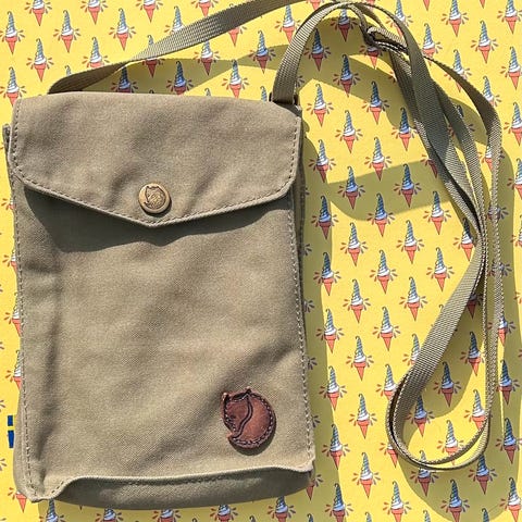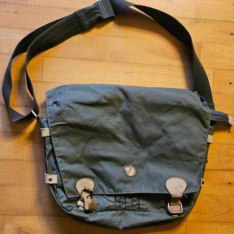 Fjallraven pocket navy med lidt patina. Den virker fint og er meget praktisk. Nypris 300 kr.