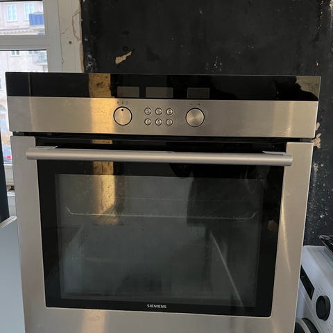 Siemens indbygningsovn med varmluftsfunktion og pyrolyse. Ovnen har et rustfrit stål og sort design med elektronisk betjening og digitalt display.