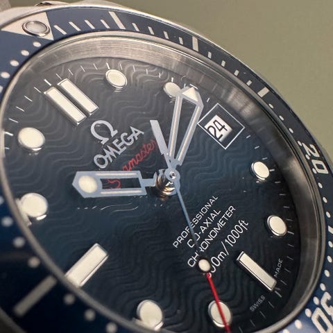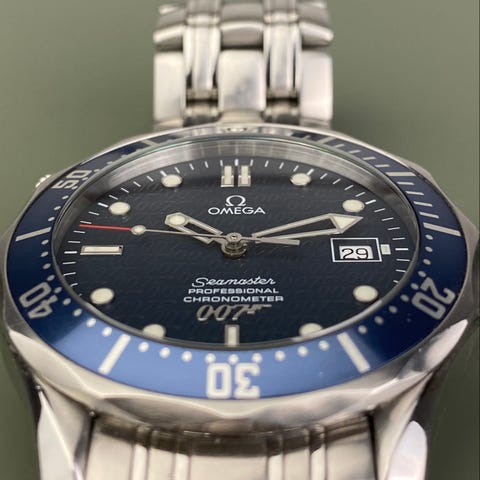 Ubrugt eksemplar af den eftertragtede Seamaster 300M, produceret som specialudgave i forbindelse med 40-års jubilæet for James Bond-filmserien. Modellen har en 41 mm urkasse i stål, den ikoniske blå bølgemønstrede skive med “007”-logo og matchende blå dykkerkrans.