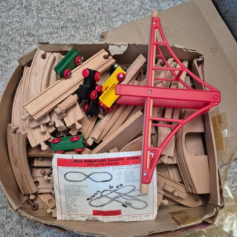 Brio Togbane og tilbehør sæt i træ med forskellige skinner, tog, vogne, figurer og tilbehør. Sættet indeholder kurvede og lige skinner, tog med flere vogne, forskellige figurer, dyr og diverse små dele til at bygge og udvide togbaneoplevelsen.