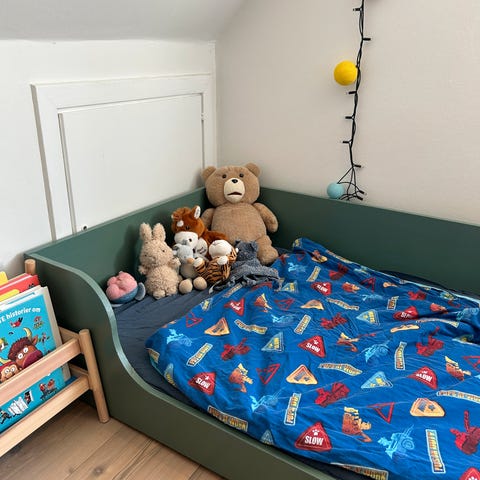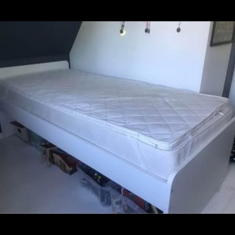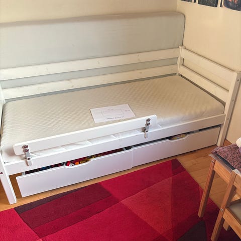 Obs! Skuffer er ikke Flexa, men passer fint. Madrassen måler 12x90x190. Der medfølger desuden en topmadras.