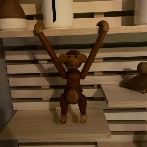 Kay Bojesen Abe træfigur lavet af træ. Figuren har bevægelige arme og ben, designet som en abe.