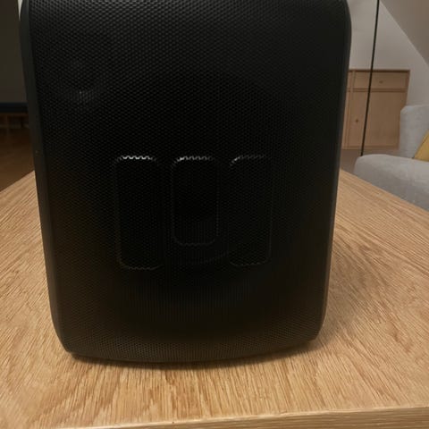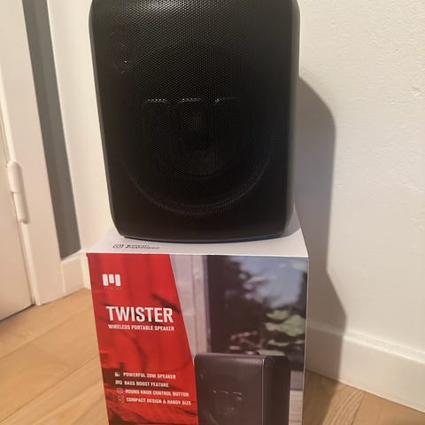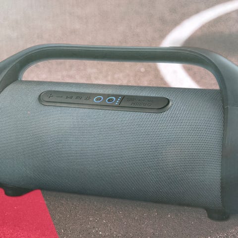 Lækker transportabel højttaler med kraftfuld lyd og indbygget bærehåndtag.