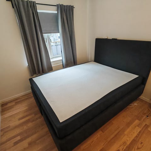 Står i vores sommerhus, købt for et år siden. Nypris 6000kr. Gavlen er i antracit grå stof. Inkl topmadras og ben. Medium hårdhed. Hurtig afhentning ønskes