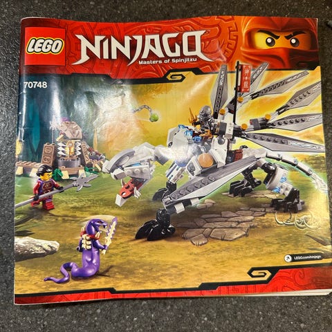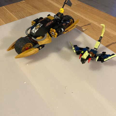 LEGO Ninjago 70733 børne legetøj sæt med motorcykel og minifigurer. Indeholder forskellige dele i sort, brun og gul, inklusive våben og tilbehør.