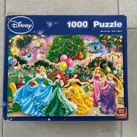 Disney Princess puslespil med 99 brikker. Motiv med Rapunzel og Flynn Rider i en båd omgivet af flyvende lanterner. Puslespillet har et farverigt og detaljeret design.