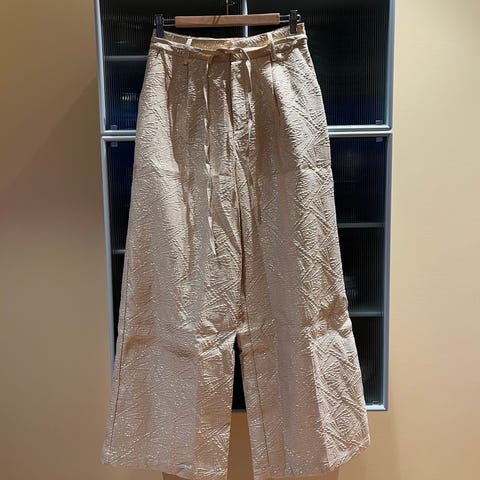 Mrk. Minus. Smukt guldbroderi på bukseben, 3/4 benlængde, elastik og bindebånd i taljen. Gennemforet. Udvendig længde: 80 cm. Fin stand.