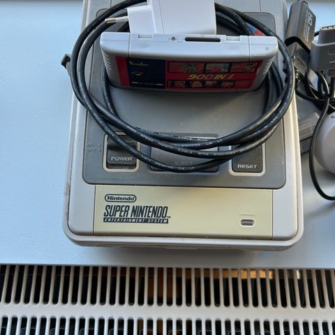 Super Nintendo spillekonsol med tilhørende controller og spillet Cool Spot. Konsollen har standard tilslutninger og inkluderer strømforsyning og AV-kabel.